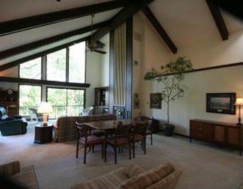 Quiet retreat in the city! Wooded view,large kitchen updated w/tons of storage,massive laundry room w/sink & desk, giant great room w/vaulted ceiling, fireplace & formal dining, wrap around deck, fire pit, 2 living areas, pool table conveys.