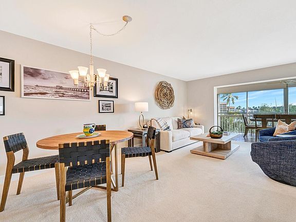 Discover the charm of this 2 bedroom, 2 bath condo with a captivating view of Naples Bay. The open floor plan seamlessly connects the dining area and cozy living room, providing an ideal space for both entertaining and tranquil nights at home. The galley kitchen features stainless steel appliances, vibrant cabinets, a tiled floor, and a breakfast bar. Retreat to the primary suite, complete with a king-sized bed, plantation shutters, and a private balcony. The master bath boasts a dual vanity, walk-in shower, and ample natural light. Your guests will find comfort in two queen-sized beds, a custom closet, and abundant natural light in their space. The second bathroom offers a tub/shower combo. Take in the Bay view through sliding glass doors and a screened-in window spanning the entire width of the home a perfect spot to relax and unwind. Gulf View provides a salt-water pool, charming tiki hut and full social calendar. Public beach access is just across the street. You can explore dining and shopping at Venetian Village, just minutes away, or enjoy an easy 10-minute drive to downtown Naples. This is a 3rd floor unit with no elevator. Live exceptionally in The Moorings!