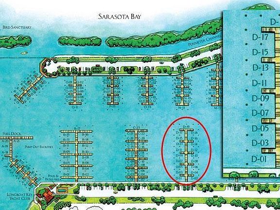 154 ft. x 29.8 ft. Boat Slip at Longboat Key Moorings Marina. Direct access to Sarasota Bay and the ICW. Significant upgrades made to accommodate large yachts; 100 amp, 3 phase power, timber guard pilings with outer pilings sistered with a single piling, and finger pier extensions - able to walk the length of the pier. The deep water marina is as much a luxury resort as any other neighborhood on the island, thanks to individual slip ownership, Marina village that includes restaurant, shopping (close to Publix, CVS, and other specialty shops), recreational and social activities, on-site maintenance and concierge services. Cable television, electric, water and wireless internet access at each slip. Free shuttle to St. Armand's Circle. The Marina has everything a boater could need. Membership at the Longboat Key Club is required for an additional fee. This parcel is subject the Town of Longboat Key Undergrounding Utility Assessment.