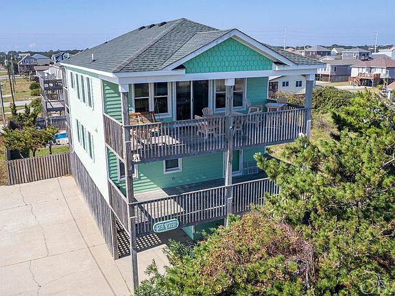 Beach access couldn't be any easier! Not only is this home semi-oceanfront, but it's on a direct beach access! It's literally just steps to the beach and with incredible ocean views. Five bedrooms, four bathrooms, with salt water pool, hot tub, fenced yard space, and a rental projection of $110,000! Panoramic ocean views greet you from the reverse floor-plan main living space, and continue onto the large covered ocean-facing deck off the top floor. You really feel like you're on permanent vacation when you're in the home because the views are so impressive from all areas of the living space. Take the party outside onto the covered deck to see the waves and feel the ocean breezes. The kitchen was remodeled in 2019 and features white cabinets, newer appliances and high granite countertops. The primary bedroom and attached bathroom are on this floor, with its own private deck. The mid-level features 3 more bedrooms with two additional bathrooms, and access to two covered porches. One porch faces due east and the other faces due west, has a hot tub, and looks over the yard and pool area. The ground level has its own bedroom and full bath, laundry and dry entry. Outside the home, you have a fully fenced grass yard that leads out to the salt water pool and lounge area. There are also two enclosed storage areas plus plenty of carport parking and entertaining space. Centrally located in Kill Devil Hills, walkable to the Avalon Pier and so many great restaurants and shops. Or hop on a bike and use the crosswalk to the soundside and the multi-use path that spans for miles along the soundfront. It's a fantastic place to be for the 4th of July. Just walk out to the top level deck or the beach and enjoy the fireworks show from nearby Avalon Pier. New upstairs HVAC in 2022, new carpet on steps in 2023, new dishwasher 2023. Pool converted to salt water and new variable pool pump in 2023.