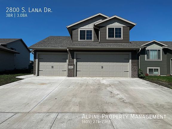 2800 S Lana Dr, Sioux Falls, SD 57106 is a single family home that contains 1,600 sq ft and was built in 2022. It contains 3 bedrooms and 3 bathrooms. This home last sold for $308,500 in July 2023. The Zestimate for this house is $326,600. The Rent Zestimate for this home is $2,100/mo.