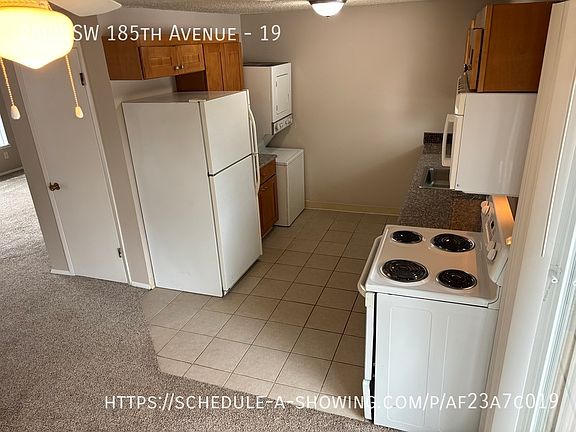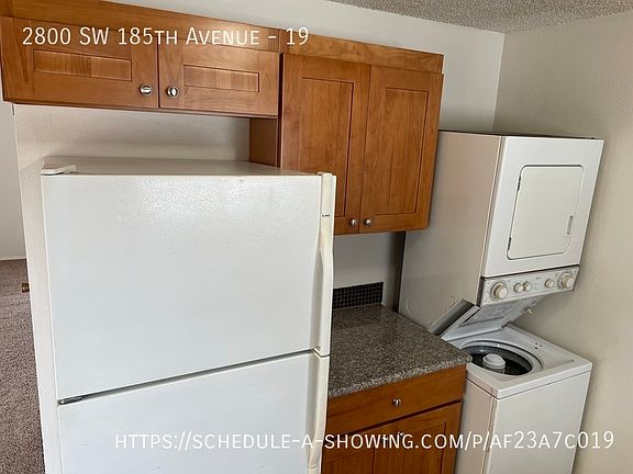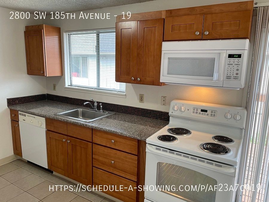 Upstairs unit w/ private back patio New windows beautiful 2 BR apartment with WD in the unit. Small cottage style apartment complex with a mixture of 1,2 & 3 bedrooms. This family-oriented complex is centrally located on SW 185th 3 blocks north of Canyon and just a short 2 minute bus ride from the max station and Tanasbourne. Your apartment has a disposal, built-in Microwave, private patio, storage closet and even walk-in pantry. Don't forget we pay WATER, SEWER & GARBAGE. $800 Security Deposit (on approved application) We are PET FRIENDLY. $400 refundable additional security deposit for first pet and $200 for second. In addition to increased deposits there is a pet rent charge of $15 per month for cat and $20 per month for a dog. Limit of 2 pets per apartment. All cats must be spayed/neutered. Apply Now: