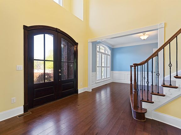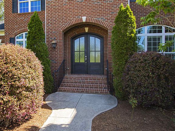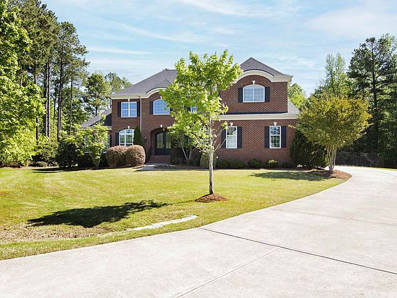 Stunning all brick, luxury home on 1.3 acre cul-de-sac lot! Dramatic two story foyer welcomes you leading to a formal dining room with tray ceiling. Two story spacious (23x17) family room w coffered ceiling all warmed by gas log fireplace. Gourmet kitchen w Wolf gas range, dual dishwashers, built-in Wolf microwave, wine fridge, desk area, granite counters, huge island w additional food prep sink. Breakfast area also has a spacious sitting area off of the kitchen. Laundry and mudroom next to the three car garage. Winding staircase leads to the balcony hallway overlooking the family room. Owner's suite w tray ceiling and beautiful sitting area. Owner's suite bathroom with dual vanities, his and her walk in closets, walk in shower and garden tub. Other bedrooms are adjoining bathrooms. Finished basement with huge bonus room, wet bar with fridge, sink, wood cabinets and granite. Additional flex space for gaming. Unfinished basement space for storage or future expansion. Basement daylights to a private landscaped backyard with play areas backing to woods for privacy. Excellent location near Cary, RTP, I-40 and Raleigh!