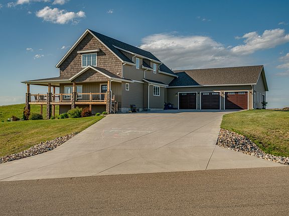 Beauty & distinction w/intricate custom details offering a welcome whisper of North Dakota's heritage. Be WOWED by this picturesque, 5,006 sqft quality-built home located on 2.7 acres in the distinguished Hawktree Development. Appreciate the living room's beautiful gas fireplace that's adorned w/ brick from a 100+ year old ND schoolhouse & rustic reclaimed ND barn wood. Dual french doors flank both sides of the fireplace, where you'll step out onto the wrap-around covered deck featuring recessed lighting, gas grill hookups & its very own gas fireplace. Imagine unwinding at the day's end & taking in the beauty of our ND sunsets. The open concept living area's gorgeous hardwood floors contrast nicely with the white-glazed custom kitchen cabinets. Quartz counter-tops, KitchenAid appliances w/ 6 burner gas stove & convection oven, soft-close drawers, open shelving, seed glass doors, subway tile, rustic galvanized light fixtures & large pantry are just a few of the things that set this kitchen apart. The large center island w/butcher block top was handcrafted w/wood from an old ND farmhouse & gives this space a uniqueness that's hard to find! The dining room's wet bar, also crafted from reclaimed wood, is perfect for entertaining & features a wine fridge. MAIN FLOOR: Office space, right off the dining room w/meadow views. Master bdrm & bath w/walk-in tiled shower and dual closets (1=walk-in). Laundry/mudroom (off the garage) w/custom cabinets, sink & ample storage. 1/2 Bath by front entrance w/antique re-purposed vanity. UPSTAIRS: Versatile & sunny bonus/game/craft/toy room etc. Plus 2 bedrooms w/walk-in closets & sitting area. Full size bathroom. BASEMENT: Family room, 2 bedrooms (one w/attached bonus room), full bath & 4 storage rooms. HUGE 2008 sqft heated garage w/5 garage doors, H/C water & drain. OUTSIDE: raised garden, & custom playhouse. This home also has 3 heat zones. Come see all the unique qualities it has to offer! UNDER CONTRACT/accepting backup offers.