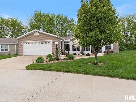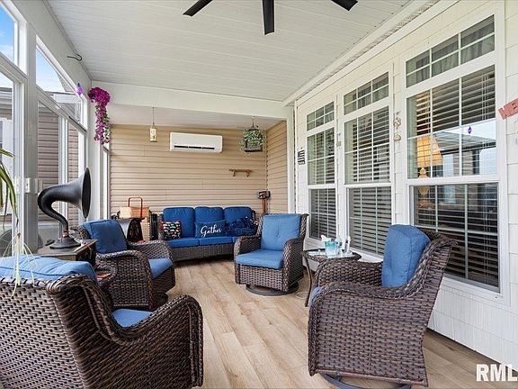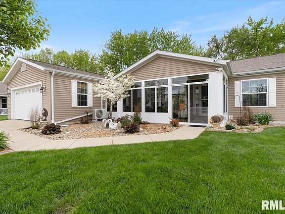 TIMBER CREEK 55+ living offers a "gated" community of low maintenance living. TC is conveniently located just minutes from I55 & I72. This 3 BD 2 BA home with office and attached 2 car garage. Wood flooring new in 2022. Carpet new in 2021. This home now has beautiful front sunroom installed in 2023, with LVP flooring, combo CARRIER heat/air for your comfort. ALL Kitchen appliances stay, cabinetry has soft close drawers. There is also a SUNSETTER awning for your backyard relaxing on the 12x24 patio. Fenced in area if you have a "petite" pet. Clothes washer and clothes dryer will stay. CWLP level pay= $133.00. The garage is finished with extra insulation. **TC Park approval is required. Application & forms available through the TC office. (Number below) TC park amenities include mowing, snow removal, services light poles, trash and recycling. The park also offers a fitness center, gardening center and game center. TC pays property taxes on the land.