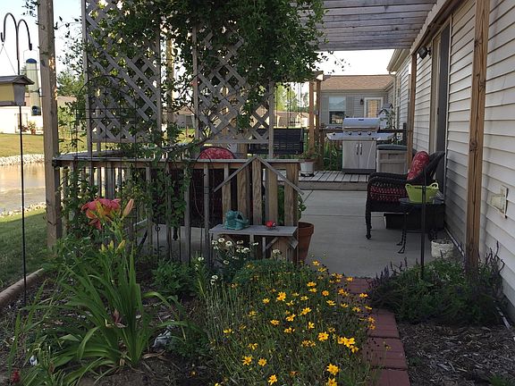 Beautiful & friendly 55+ gated community living with lots of extra's! Sit on the patio/deck w/pergola & swing overlooking the peaceful pond with fountain. Open split plan with large kitchen, huge pantry, Kitchen Appl. Stay! Upgrades throughout! Well built manufactured home.