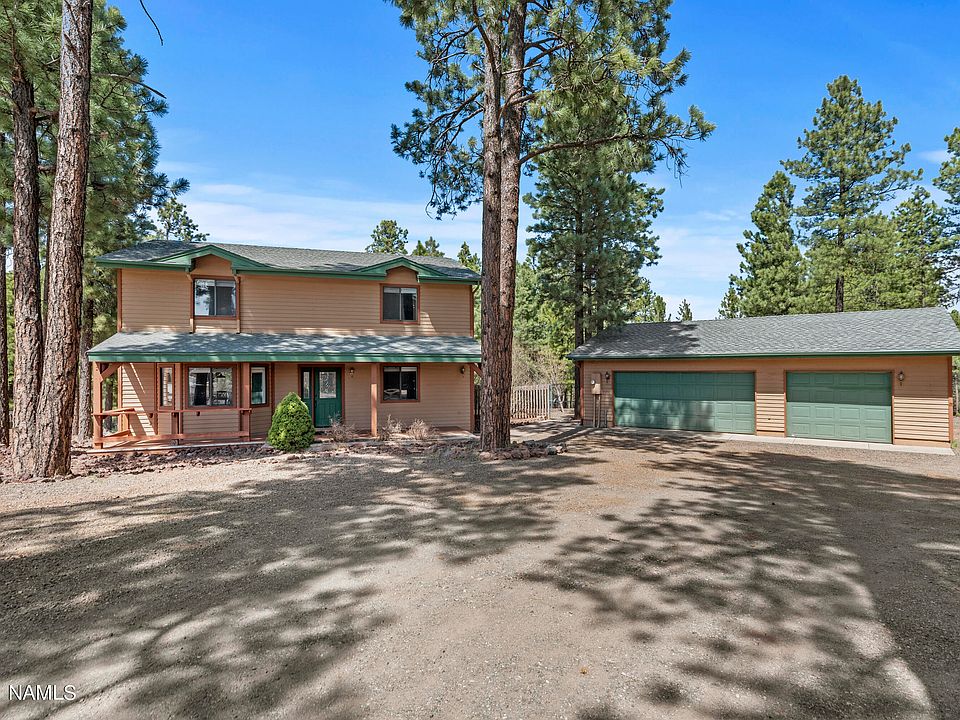 The unobstructed views of the San Francisco Peaks, nearly half acre of mature pines & large covered back deck perfect for entertaining and BBQs. If you are looking for Views look no further! With 4 bedrooms, 3.5 baths, the modern interior has been totally upgraded w/ a sunny kitchen, great room w/ gas fireplace, luxury Pergo floors & knotty alder doors. Two primary suites, one on the main floor & a second w/ stunning peak views, spa tub & steam shower upstairs. There are also 2 additional bedrooms & a loft/flex providing space for everyone. The back yard has a fire pit & built in picnic table. The detached 3 car garage has an additional bath.