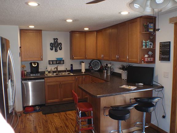 Permanent siding. Walk out deck. Home has been redone: newer kitchen with high end appliances & peninsula eating area w/ room for stools. Oak doors & stairway, Newer carpeting & windows. Fenced yard with great deck w/ extra large wired workshop/storage shed included.