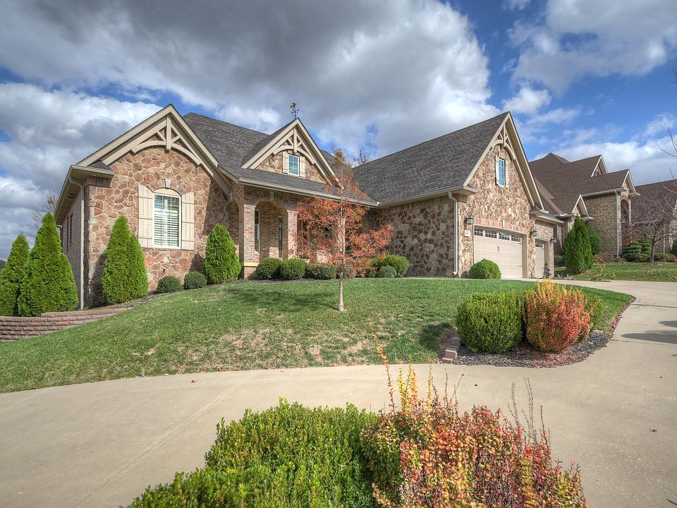 Newer home in gated community, brick & stone, 4 bedrooms, 3 1/2 baths, exceptional master suite. 21ft. great room with vaulted ceilings, gourmet kitchen, storm shelter. Beautiful lake views, deck plus patio plus custom stone fire pit with built-in seating. Corner lot, 3 car garage.
