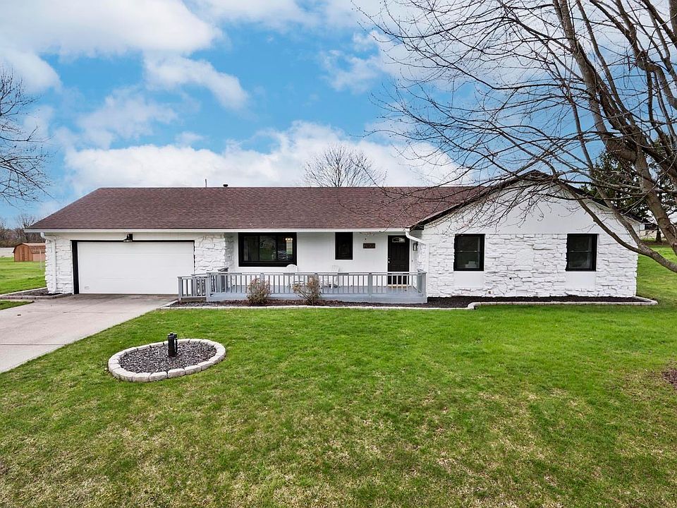 This beautiful 3 bedroom, 2 full bath RANCH home in Mooresville has too many updates from exterior to interior to list! This is a MUST see! The spacious Great Room features vaulted ceilings and a 2-sided floor to ceiling stone fireplace which creates a warm cozy atmosphere. Newer laminate flooring throughout. Eat in kitchen as well as dining area too. Primary bedroom has a full private bath. All NEW windows, furnace and AC in 2022. The entire exterior of the home received a facelift and an entirely new look in 2021 with the white stone and black trim. HUGE backyard too with fire pit and large open patio for entertaining! A country feel but yet close to town.