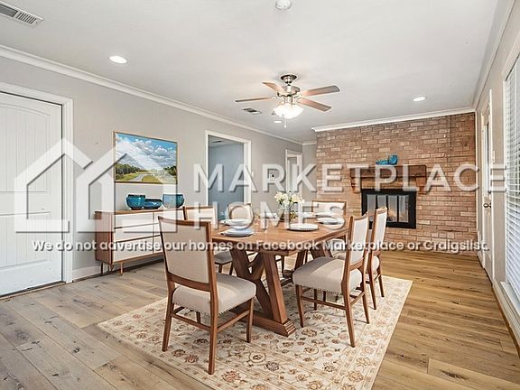 Charming brick fireplaceWood look laminate flooringStainless steel appliancesGranite countertopsCovered back patioCorner lotFully fenced backyard