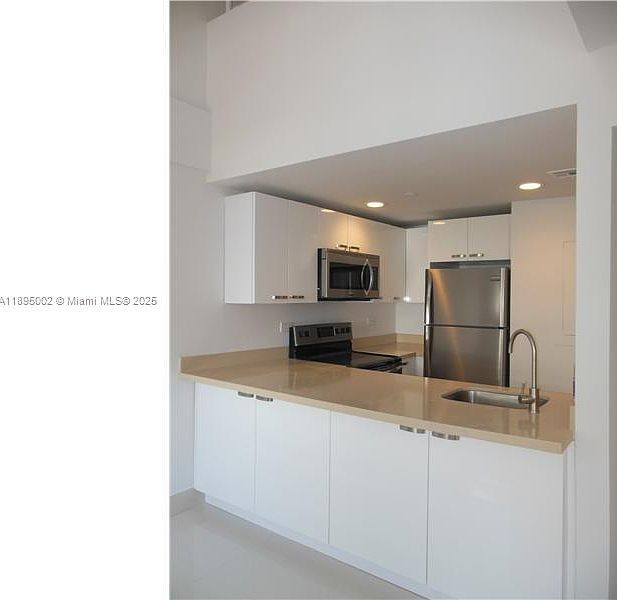 Renovated bathroomLots of natural lightModern kitchenWhite tile floorsWindow treatmentsStainless steel appliances