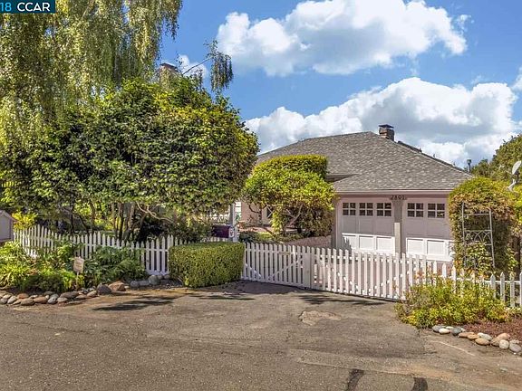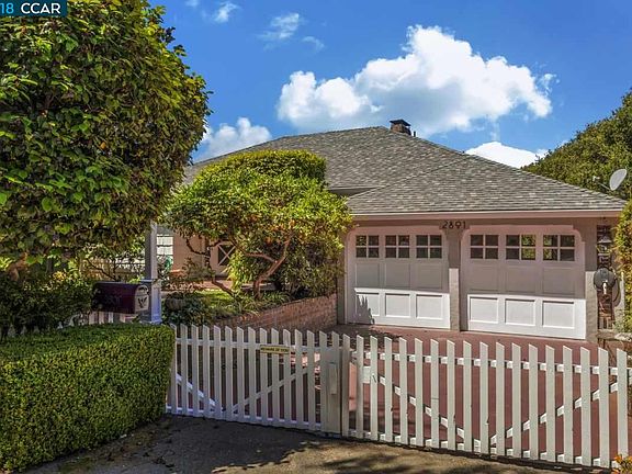 Storybook shingled cottage on quiet cul-de-sac in Wilshire Heights with Bay and city views! This is the house you always wanted to go on the market because it is adorable: white picket fence borders mature trees and heritage roses, "little library" next to flower-covered arbor, fragrant jasmine, an abundance of fruit trees, and garage with new carriage doors. Down the adjacent trail you'll find Joaquin Miller Park, where you can hike, bike, and picnic on the verdant 500 acres. Additionally, you're within strolling distance to Head-Royce School. What make the interior special are the huge windows with views, the abundant light from new skylights, and the high-end finishes. Wide-plank oak floors lead through the large living room & formal dining room to the remodeled kitchen with granite counters, breakfast area, and walk-in pantry. The deck beyond is perfect for entertaining & taking in the amazing views of the Bay and AT&T park. Downstairs, enter the luxurious master with en-suite bath