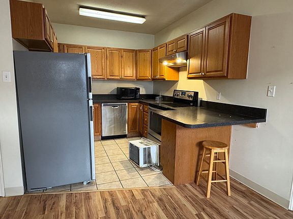 Just painted, new appliances, laminate with new carpet in bedrooms.