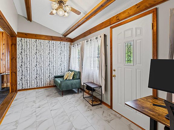 Step inside and you'll find a functional layout that's easy to live in and enjoy. The main level features a cozy fireplace with a stone surround, perfect for winter evenings, plus a bright sunroom with new flooring (2023) that brings in plenty of natural light. Unique knotty wood paneling adds warmth and charm throughout, while thoughtful updates ensure modern comfort. The kitchen has brand-new flooring (2025) and comes equipped with a Samsung Bespoke smart refrigerator and smart range (2025). Upstairs, the updated bathroom shines with a new vanity, shower tile, and a smart toilet with heated seat and bidet (2024).