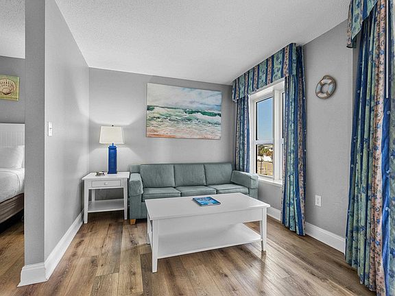 Your Oceanfront Retreat Awaits: Turnkey Living at Bay Watch Resort! Are you a sun worshipper dreaming of a hassle free beach escape? This outstanding low-floor end unit at the oceanfront Bay Watch Resort is your perfect match! Experience true turnkey living with extensive updates within the last year, including new LVP Flooring, modern furniture, a new refrigerator, microwave, granite countertops, updated vanity, plumbing fixtures, a wall-mounted TV, fresh artwork and even new baseboards. The cabinets are just two years old, and with no carpeting, it's ready for you to enjoy. Indulge in Bay Watch Resort's incredible amenities, featuring over a dozen water attractions, muliptle indoor and outdoor pools, relaxing spas, a well equipped gym, a fun kiddie pool, and both indoor and outdoor lazy rivers. The fun extends to on-site dining at the restaurant, a lively sports bar with entertainment, including Sandtraps famous karoake nights! Enjoy peach of mind with all utilities included, even in-unit electricity, so you'll never worry about high air conditioning bills. This prime locations puts you just minutes from Main Street's vibrant festivals, parades and concerts, plus Barefoot at the Beach, premier shipping, and a diverse array of dining options. Whether you're seeking a personal beach sanctuary or a savvy investment, the on site Conference center helps ensure consistent rental income. While the building is oceanfront, and this bright unit offers a peep of the view from the balcony, its designed for maximum light and comfort. Sleeping four comfortably, this condo presents an exceptional value and a smart alternative to a full one-bedroom, offering significat savings on both purchase price and HOA dues. Don't miss this opportunity to own your piece of paradise! Contact me today to schedule your private showing.