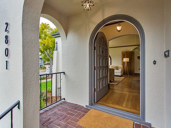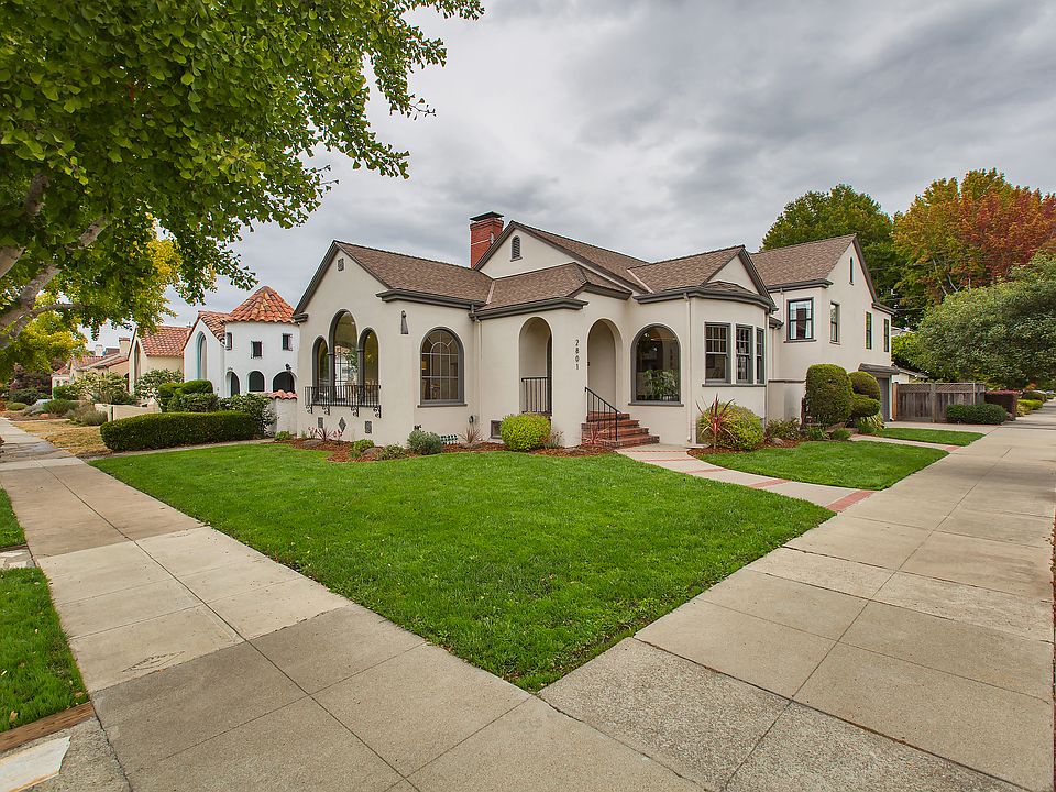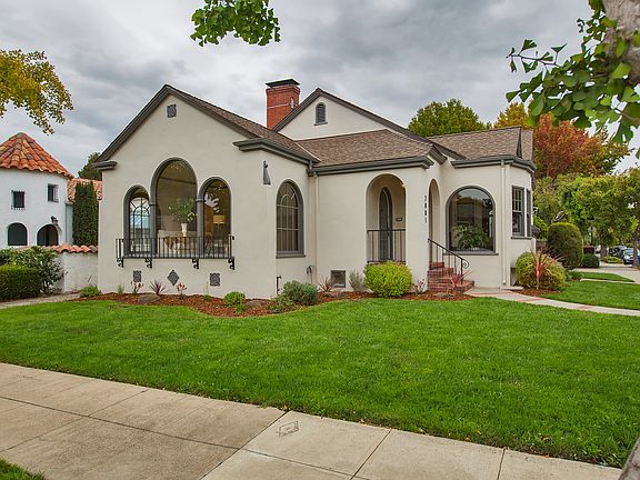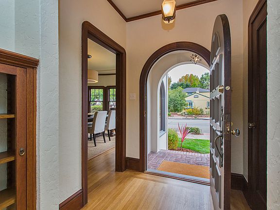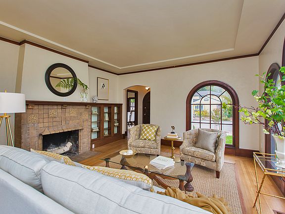 This stucco Tudor style home sits prominently on the corner, undoubtedly designed to be admired from both vantage points. The house has wonderful curb appeal with arched windows and doorways, decorative wrought iron, and an architecturally striking hipped roof. The entrance has a stately brick portico and a solid oak, arched front door with vintage brass hardware. Once inside, a welcoming foyer opens to the formal living and dining rooms, and features a coat closet, a vintage pendant light, and beautiful hardwood floors that extend from the entrance through most of the rooms on the main level. The large living room is truly elegant and features a high, stepped ceiling, picture rails, and beautiful arched windows and casements. A stunning arched picture window reaches the ceiling and is flanked by an arched window on either side. Unusual arched casement windows with divided lights are on both sides of the room and flood the room with bright, natural light and air flow. One of the home’s many impressive vintage elements is the stone tile fireplace in the living room. A beautifully constructed pair of built-in bookcases is to the right of the fireplace, with brass pulls on the etched-glass door fronts. The formal dining room is to the right of the foyer, and has many of the same gracious details found in the living room. Two exceptional features of the spacious room are a beautiful built-in hutch with a mirrored sideboard and display cabinets, and a large bay window wall in which four double-hung windows bring an abundance of light into the room. A large, arched picture window faces the front door, a continuation of the design element of arches that is pervasive in the house. A door with divided lights leads to an outside porch with stairs to the sidewalk, offering additional light. The thoughtfully remodeled kitchen is adjacent to the dining room and features many well-placed soft-close drawers and cabinets as well as a pantry with pull-out drawers. The counters are quartz and an understated backsplash consists of mosaic glass tiles. Stainless steel appliances include a Whirlpool dishwasher, Kenmore Elite French-door refrigerator, GE Profile dual ovens, and a 5-burner gas stove top and hood. An island breakfast bar is perfect for casual meals, while the breakfast room off of the kitchen features a bay of windows, vintage built-ins and is roomy enough for a family table. A spacious bedroom is down the hall and provides a perfect space for a guest bedroom on the main level, or a playroom or family room. The bedroom has hardwood floors, high ceilings, and picture rails. A linen closet and half bath are situated across the hall from this bedroom. Stairs next to the half bath go down to the laundry room, bonus rooms, attached garage, and access to the backyard. From the main level, a half flight of stairs leads upstairs to more bedrooms and attic access. The large, sun-filled master bedroom suite features a cheery bay with three windows and a bench seat overlooking the backyard and garden gazebo. This room also features picture rails, two double-hung windows on either side of the bed, and a large, walk-in closet with a custom closet organizing system. The generous en-suite master bathroom has a tiled floor, oversized dual-sink vanity, a skylight, and a window with opaque glass for ventilation. The bathroom also has a linen closet and a tub/shower combination with sliding glass doors and a brilliant white tile shower surround. Two other bedrooms are located on this floor, each with picture rails, roomy closets, and numerous windows providing plenty of natural light. One of the bedroom closets offers access to the large, walk-in attic that offers loads of space for storage and potential opportunities for an addition. The home’s second full bathroom with a tub/shower is conveniently located between the second and third bedrooms.