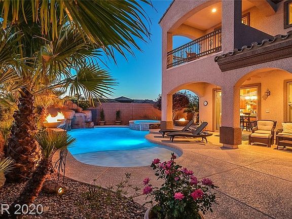 Cul-de-sac corner lot w/city & mtn views from balconies. Backyard w/pool, slide, spa, firepits, lush landscape, gated courtyard. Kit w/granite, SS appliances, 2 convection ovens, warming drawer. Familyroom w/cathedral ceiling, fireplace, media niche. Master down w/walk-in closet, separate tub & shower. 4 large beds + loft/office w/its own balcony. Wrought iron staircase, plantation shutters, laundry w/sink & cabinets, epoxy garage floors & more.