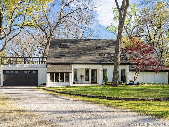 Secluded house on 2.27 acres with lots of character. 3 bed, 3 bath with 2 car attached garage and shop for 3+ cars, storage and a work area. 2 storage sheds, full fenced in property with dog run. Large patio balcony over attached garage. Quaint coffee bar area and updated kitchen. 5 minutes from Tulsa hills shopping. Master bed has fireplace and separate patio exit. Loft area for 3rd bedroom/gameroom with walk in closet and remodeled bath. Circle drive and amazing street presence. Unique property in Jenks schools.