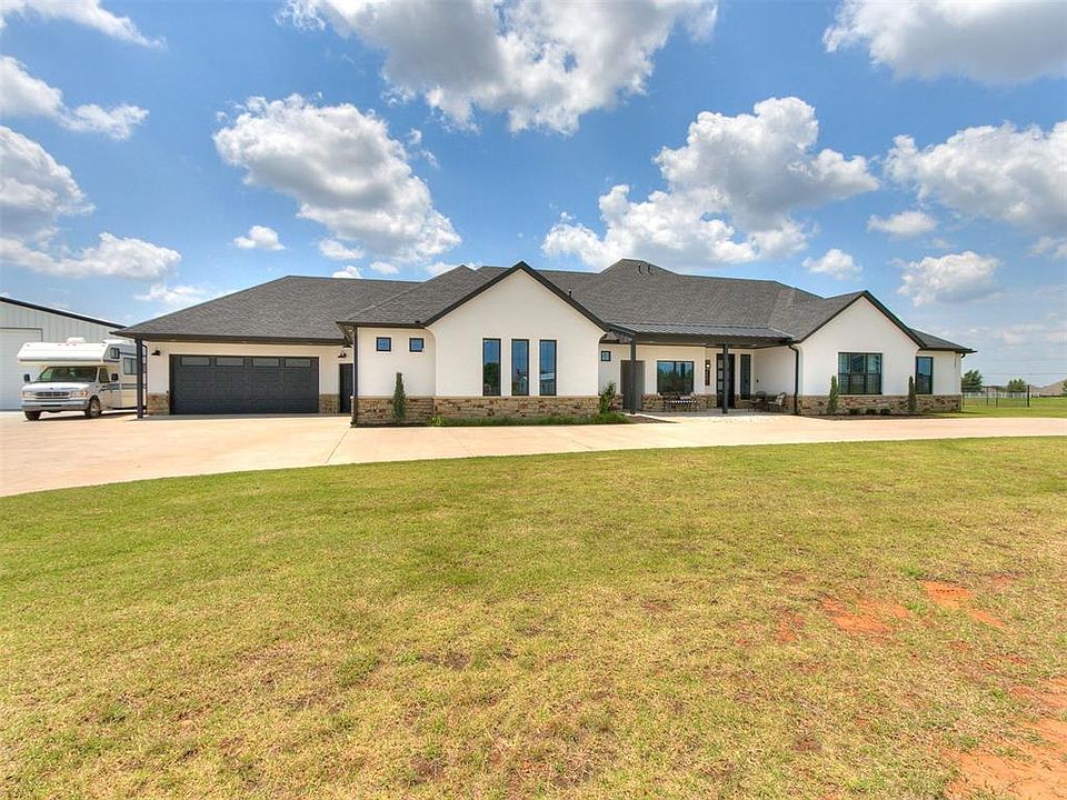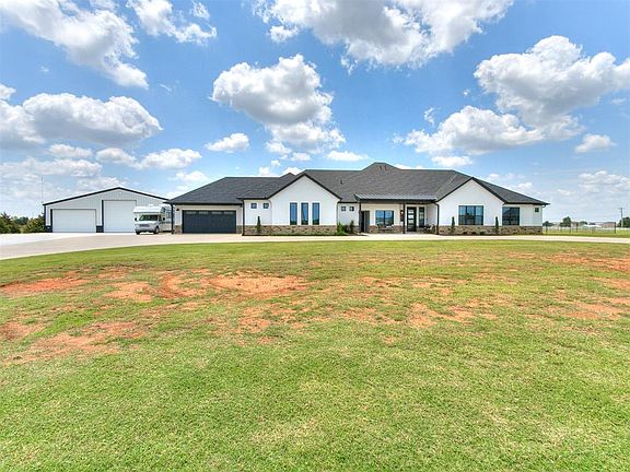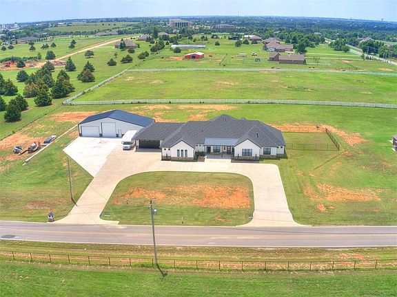 ABSOLUTELY STUNNING custom built home on 2.5ac located in Edmond schools! Get a little taste of country without leaving the city. From a kitchen that would be any chef's dream to the primary suite featuring two individual water closets and 8'x22' closet, there was no detail left out during the design phase. Walking into the home you are greeted with natural light that flows into an entertainer's paradise. The kitchen features a built in 60" fridge/freezer combo, two 30" gas ranges, LED under-counter & baseboard lighting, a 4'x9' island with custom chopping block top & floating chopping block shelves to match the island. From there, step outside to "The Porch" which features 18' tall vaulted tongue & groove railcar ceiling, saloon style bar w/ space for 8 barstools, billiards area, large gas fireplace w/custom mantel from a 200yr old barn, built-in speakers and 2 commercial grade glass garage doors w/screens. Back inside the main living area you find two generously sized bedrooms w/ oversized walk-in closets, w/ a Jack-n-Jill bathroom. The HUGE primary suite features two individual water closets, two separate vanities(one with bi-fold mirror and hidden jewely hooks), a dreamy closet with luxurious carpet, and a massive 6'x10' walkout shower w/ dual shower heads, niche & bench. Other features include a pet room w/doggy door access to a fenced backyard, and an abundance of storage space. The 30'x60' insulated shop features RV electric, water & sewer hook-ups, 2 offices, a full bath & 3000sqft concrete parking area. Do not let this rare jewel pass you by! A full list of features can be found in the supplements.