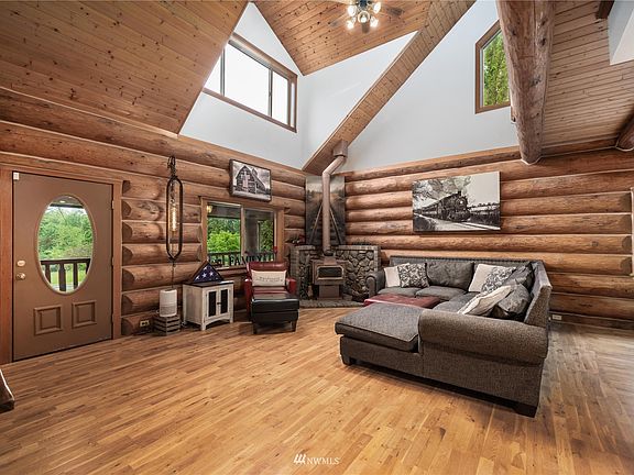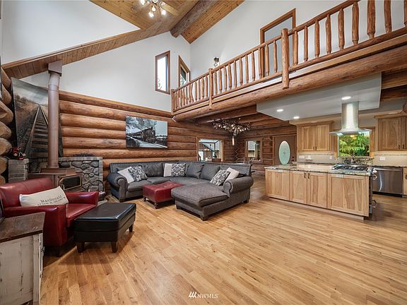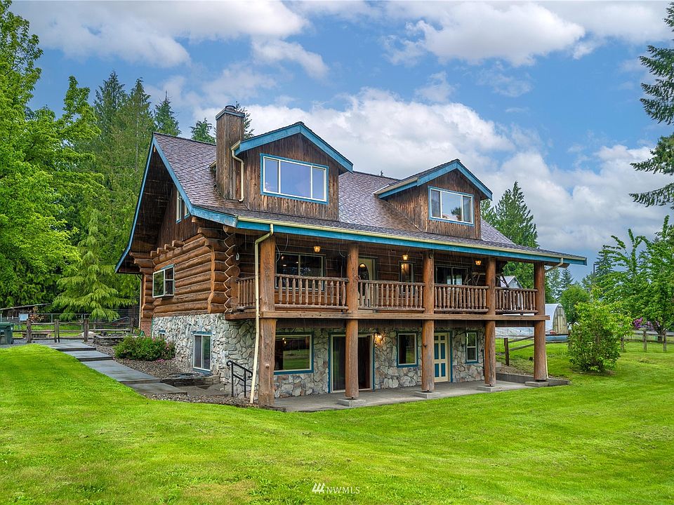 Absolutely magnificent log home on 5 acres of amazing private living! Picturesque setting with beautiful patio and quaint front porch to enjoy the breathtaking Mt Rainier views and dazzling sunsets. This remarkable home boasts over 3000SF and perfectly combines rustic and luxurious in one extraordinary package. Stunning kitchen features walk-in pantry, SS appliances, gorgeous slab granite counters, and exquisite wood cabinetry. Incredible log-rail staircase and balcony lead you to the primary suite with Juliet balcony, WIC and elegant spa bathroom. Fully finished daylight basement is a fantastic family room with den/possible 4th bedroom or an opportunity for multi-generational living! Huge 2 car garage with XL shop/storage space for toys!