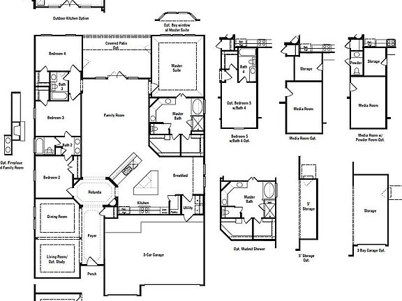 Formal Living/optional Study and Formal Dining off of Foyer. Grand rotunda entrance. Split plan with Master bedroom on one side and 3 spare rooms on opposite. Island kitchen open to family room. Breakfast nook off kitchen. Family room with optional French doors off back to covered patio. Dual closets at Master. Optional Bedroom 5 w/ Bath 4 in lieu of 3rd bay at garage.