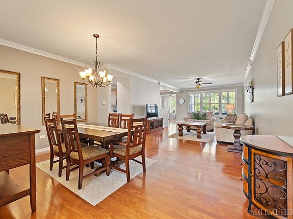 Welcome to this elegant Wilmette model home in Edgewater of Del Webb, which offers fabulous updates and a private location backing directly onto a walking path and nature area. The covered front porch welcomes guests to this lovely home with an open floor plan featuring hardwood floors, white trim with crown molding, panel molding, and custom window treatments, including plantation shutters. This Wilmette model boasts a formal foyer with a guest closet, a large combination great room and formal dining room, and a kitchen equipped with 42" maple cabinets, Corian countertops, stainless steel appliances, and a pantry cabinet. A separate eating area is open to a sunroom with access to a brick paver patio, complete with a SunSetter awning, offering beautiful views. The primary bedroom features a large bay window overlooking the backyard, a spacious walk-in closet, and a primary bath with dual vanities, a soaking tub, a separate shower, and a private commode. The front foyer leads to a hallway where you will find the second bedroom, perfect for guests, a second bath, and a large den that could also be used as a third bedroom. The utility room offers a washer and dryer with a full wall of cabinets above for ample storage, a utility sink, plus all the mechanicals (furnace & A/C new in 2020) are located in a private closet, hidden from view. There is an extended two-car finished garage with attic access, a beautiful epoxy floor, and two large wall storage cabinets, great for extra storage. Enjoy the professionally landscaped yard with a sprinkler system. Residents can enjoy all the amenities, including a clubhouse, indoor/outdoor pools, pickleball, bocce ball, a park, tennis courts, an exercise facility, walking paths, and plenty of social clubs. The location is also close to Randall Rd. shopping, restaurants, and I-90 for an easy commute. This move-in-ready home is in pristine condition and ready for a new owner!