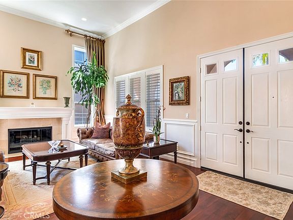 Jacuzzi tub. Travertine and hardwood flooring flow throughout the home, complemented by crown molding, custom