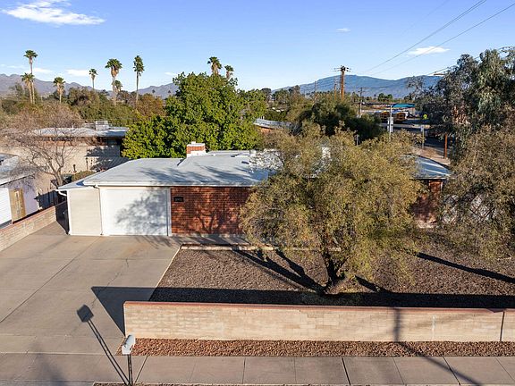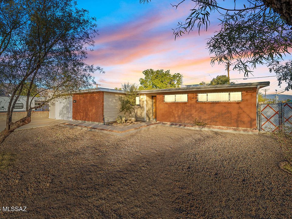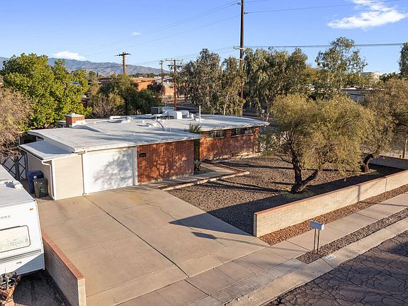 Affordable opportunity for 1,543 SqFt 3 bed/2 full bath 1963 Mid-Century Modern wire cut red brick ranch on premium .17 acre R-1 corner lot, attached 394 SqFt extended tandem garage w/6 in-ground floor illumination and storage, no HOA, RV parking in Glenn Aire neighborhood located in thriving Central Tucson. Ideal for first time homebuyers, Air-BnB property, seasonal visitors, parents looking to secure student housing and investors alike (rented for $1750 per month)! Featuring W/E orientation, Catalina mountain views, metal gutter system, single story/no stairs, spacious concrete driveway, concrete sidewalk, on and off street parking, low care front yard, custom metal security window bars and front metal security door.Inside buyers will appreciate diagonal cut tile and fresh carpet, skylights, ceiling fans, flagstone wood burning fireplace in living room, family room and bonus room both have updated energy efficient double pane windows, kitchen boasts real wood cabinets, bottom cabinet pull-outs, crisp white tile countertops, white subway tile, white electric stove with exhaust hood, white side by side refrigerator, exhaust fan, double metal sink, garage disposal, garden window, dining area, walk-in pantry/internal laundry room complete with white washer and dryer included. Sizeable guest bedrooms, primary bedroom features private ensuite full bathroom with walk-in tiled shower.