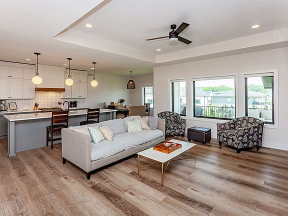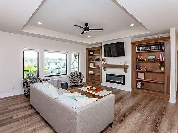 This contemporary walkout ranch is truly one of a kind, offering over 3,500 sq ft of beautifully finished living space with 5 bedrooms and 3 full bathrooms. Every detail has been carefully curated to impress. Step into the heart of the home—the gourmet kitchen—featuring quartz countertops, a striking 10-foot island, slate appliances, custom-built hood vent, and soft-close drawers and cabinets. A spacious pantry with ample shelving keeps everything organized and within reach. The open-concept dining area leads to a large covered deck—perfect for entertaining or enjoying peaceful views. The living room boasts a 10’ tray ceiling, an electric fireplace, and custom floor-to-ceiling built-ins that add both style and function. Convenience meets luxury with main-level laundry and a primary suite designed for retreat. The primary bathroom includes a dual vanity, fully tiled shower, and custom mirrors with tile backsplash. Enjoy direct access to your own private master deck. Downstairs, the finished lower level offers an abundance of space for relaxing or entertaining. The custom wet bar with stunning backsplash and lighting is a showstopper. This home blends modern design with comfort, making it a perfect fit for those who love stylish living with functional space. All information obtained from seller and public records.