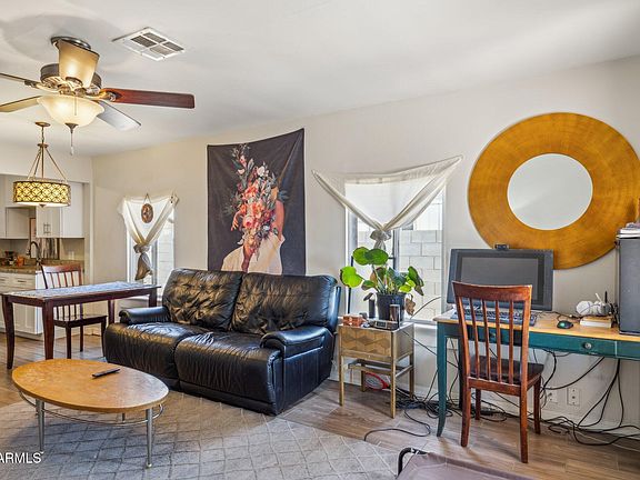 Exceptional value on this c.1936 remodeled Phx bungalow! The interior is completely updated and move-in ready. The big items are done: NEW HVAC in 2024 with updated ductwork and NEW roof in 2021. The inviting front porch is lined with Saltillo tile and overlooks the fully-fenced front yard with mature, desert-adapted trees. The kitchen features classic white shaker cabinetry, slab granite counters, black appliances (all appliances included) and a built-in office/desk area. The open floorplan allows for flexible use of the space. Gorgeous wood plank tile flooring flows throughout the living space. The formal dining area sits between the kitchen and living room with a modern chandelier and picture window. Both bedrooms have neutral carpet and ceiling fans. The bathroom is fully-remodeled with a tiled shower/tub surround and newer vanity. The rear yard is spacious and low maintenance with block fencing and 2 RV gates (one off the driveway and one with alley access). Additional upgrades include: dual pane windows, 6 panel interior doors, ceiling fans and a storage shed. Nearby many Phoenix staples and destinations in a very walkable neighborhood (walkscore of 75/100).