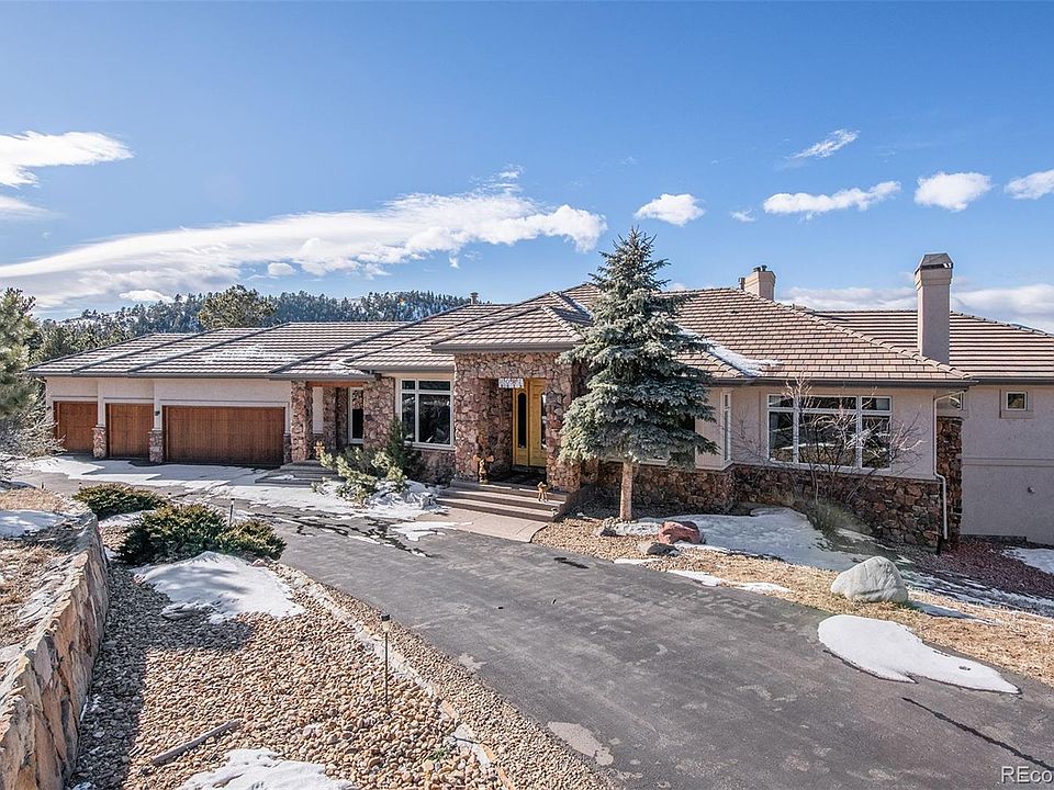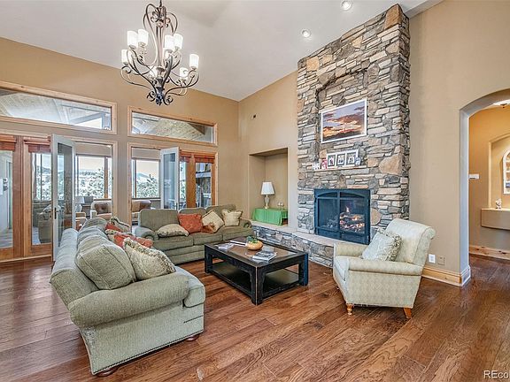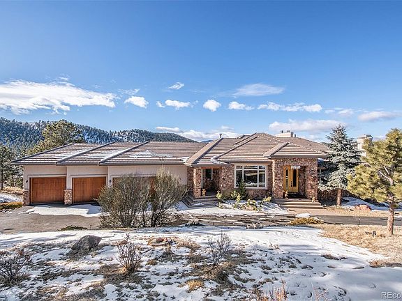 Custom-built raised ranch home featuring 4 bedrooms, 6 bathrooms, 7,270 sq/ft & 5 private acres with mountain views. Enjoy the luxurious finishes throughout including vaulted ceilings, 7 gas fireplaces, hardwood & slate floors, new carpet, radiant in-floor heating & surround sound. The gourmet kitchen features 6 burner gas stove top, double ovens, warming tray, 2 dishwashers, granite countertops, 2 islands & a butler's pantry with wine fridge & ice machine. Enjoy the master bedroom suite with large master bath, walk in closet, gas fireplace, steam shower, Jacuzzi tub & private balcony. The walkout lower level features a game room, theater room, wine cellar & 3 bedrooms each with a private bathroom. Enjoy the 2 enclosed & heated sunrooms with 1 featuring a Viking gas grill, keg fridge & small fridge. Outside features include; 2 large covered patios, new hot tub, paved driveway & 4 car attached garage with radiant in-floor heating. You're only minutes away from open space, trails & I-70. View both the property virtual tour link and a full 360-degree Matterport walk-through link to get a feel of the home's layout.