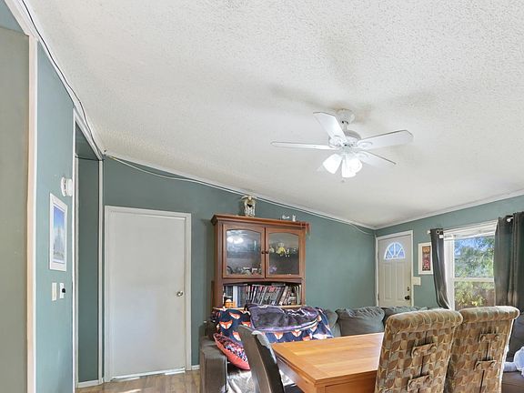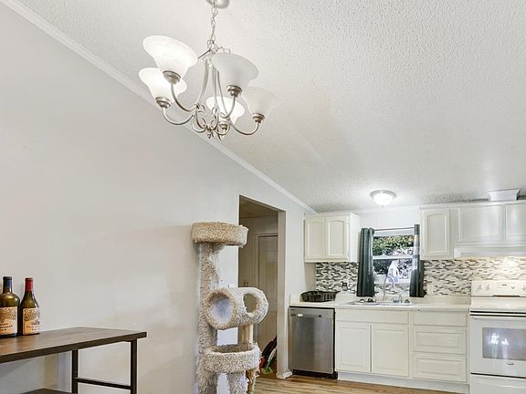 This nice double wide manufactured home sits on its own lot! The yard is fenced and includes a shed for storage and raised garden beds. Inside the home are vaulted ceilings and large windows that bring in lots of light. The kitchen offers plenty of storage, ample counter space, and comes with all the essential appliances. You'll love the rustic style cupboards and salt and pepper coloring of the tile backsplash. Off the kitchen is the conveniently located laundry area, with access to the side yard. The primary bedroom has a good amount of space and includes a 3/4 en-suite bathroom with unique vanity and walk-in shower. The additional bedrooms are located just off the living room and have easy access to a full bathroom. Come see it today!