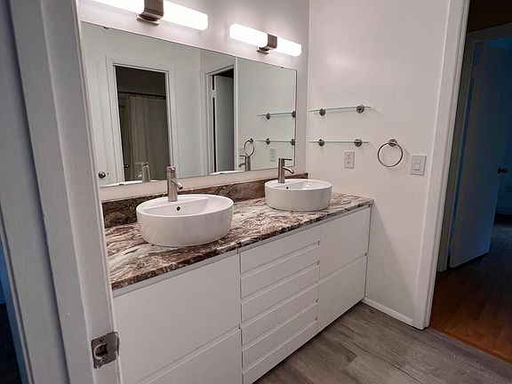 The bathroom will be shared by the two tenants and includes dual sinks. The shower area is separated by a door for added privacy.