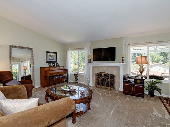 This beautifully remodeled Katrina model offers approximately 1,250 Sq. Ft. of resort style living in one of Orange Counties prime 55 + communities. This wonderful 2 Bed, 2 Bath home, situated on a view lot and single loaded street, is ready for its new owner. The kitchen has been completely remodeled and features granite counters, soft-close drawers and cabinets with pull-out shelving, gas range, tile floors, hillside view from the window and a wonderful breakfast counter between the kitchen and the dining room. The dining room will comfortably seat 8 to 10 people. The living room with its vaulted ceiling and its updated wood/gas fireplace with gorgeous wood mantle and marble surround begs you to relax and read a book or enjoy your favorite TV show. The spacious master bedroom has a slider door opening to the rear for the house and an en-suite bath with newer granite topped cabinets. Unseen improvements include new Pex plumbing and new HVAC ducts and diffusers. The large, canopied patio is a great place to enjoy a morning cup of coffee or tea, or to grill a steak, or simply sit and relax! There is plenty of built-in storage in the spacious 2 car garage and in the ample, attached, storage unit behind the garage. PRICED FOR QUICK SALE!!