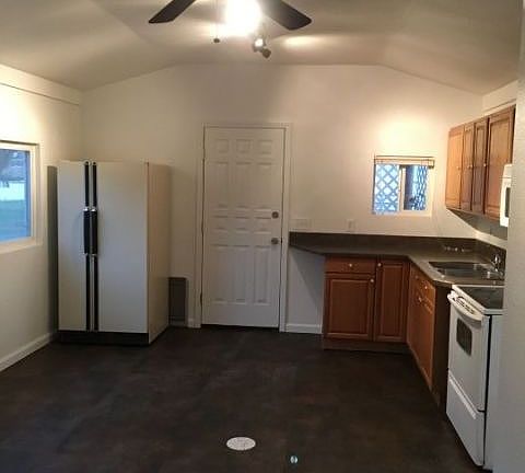 This is a super cute stand alone cottage that shares a 1 acre lot with one other house. This is small but has everything you need. Full kitchen with side by side fridge and microwave, a full bathroom with washer and dryer hookups, and a quiet and secluded setting. 1 year old kitchen counter, flooring, vanity and toilet.