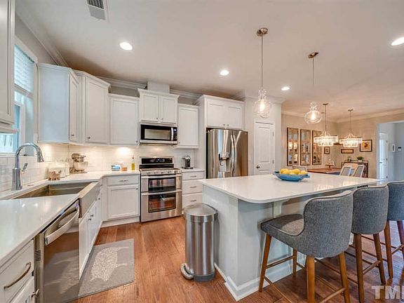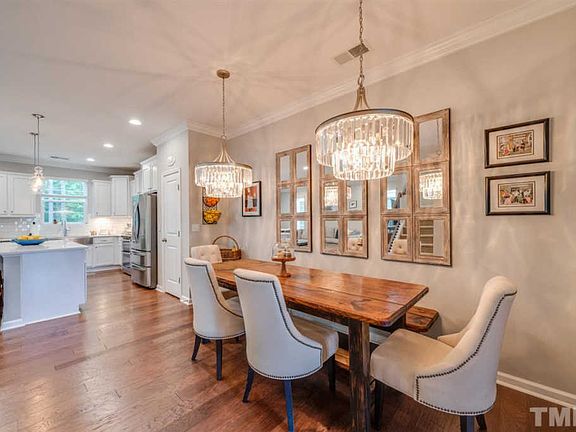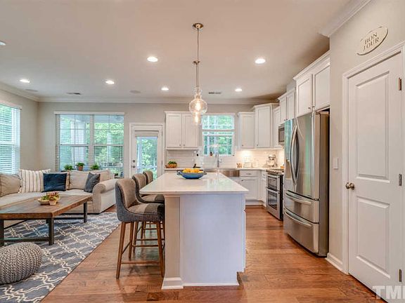 Luxurious LOW MAINTENANCE LIVING in Apex's premiere "live/work/play" n'hood! End unit townhome w/ every upgrade imaginable. High end flooring & lighting EVERYWHERE. Chef's kitchen w/ quartz tops, double oven, 5 burner gas range. Master w/ custom closets & opulent en-suite. Screened patio w/ endless wooded views! Walk to n'hood pool/state of the art clubhouse, & any of the NINE community parks! Sweetwater offers 45 acres of proposed commercial/retail/ entertainment area-all steps away from your front door.