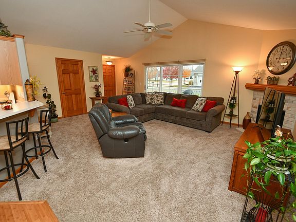 Meticulously maintained 2 Bedroom condo in Rivers Crossing. The open concept living room features vaulted ceilings, cozy gas fireplace, and remote controlled custom shades on the new patio door that leads out to your own private deck. The nice size kitchen has a breakfast bar, beautiful bamboo hardwood floors, large pantry and separate Dinette. This condo has 2 full baths, 2 car garage, main floor laundry, ample storage and a partially finished basement.