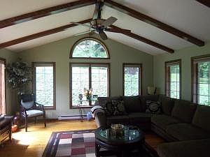 Public Remarks: Lovely wooded setting. Stunning 1st floor family Room/Sun room with large windows on all walls & beamed cathedral ceiling. 1st floor master MBR. Hardwood Floors in Dining area. Beautifully finished basement rec room w/ wood stove + storage space. Private wooded rear yard