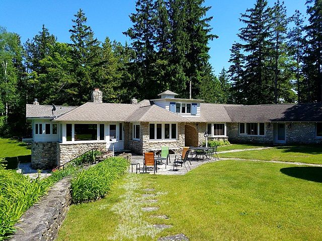 The Sanctuary - perched on the bluff overlooking the waters of Little Sister. This estate-like and spacious home is filled with character, stonework and charm, and has been completely renovated. The living room features an arched fireplace, stone accent walls, a built-in wet bar and commanding views of the Bay. The dining room boasts its own fireplace, a built-in hutch and buffet, and a nook with a vented grill. A reading room, loft and 4 bedrooms ensure there is plenty of room for family and friends. The highlight of the outdoors - in addition to that amazing view - is a stone watchtower. Wander the paths through the gardens, and then return to relax and unwind in this delightful Ephraim home.