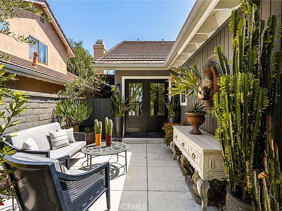 Welcome to the hidden masterpiece of Mission Viejo, a single-story gem discreetly nestled behind lush landscaping in a quiet corner of the community. A designer’s dream, each upgrade was hand-selected with care & intention, from wood-look tiles to soaring cathedral ceilings. Entertain guests on the private front patio, enclosed for privacy amid vibrant greenery. Double doors invite you to an expanded foyer, a custom enhancement chosen to maximize light & space. A comfortable 3rd bedroom has been dramatically transformed into an elegant office, with sleek built in bookshelves from floor to ceiling. Tall dual-paned windows and doors keep the space bright with a view of tranquil greenery (and a closet has been preserved for simple conversion back to a bedroom). The great-room living area will take your breath away, with customized enhancements made to draw the eye upward to vaulted ceilings & clerestory windows. Bifold windows and French doors seamlessly integrate the open living area with outdoor greenery, creating a harmonious blend of indoor and outdoor living spaces. The open floor plan is bright & flexible, perfect for formal dinners or casual meals at the expansive quartz countertop. Enjoy a full-sized, gourmet kitchen. From custom walnut cabinetry to a built-in subzero refrigerator, gas range, and wine chiller—no detail has been overlooked, and no expense spared in bringing this dream home to life. Step outside to find a private island paradise beneath the ambient lights of a spacious gazebo, surrounded by low-maintenance, hand-selected greenery that fosters a soothing atmosphere (with minimal maintenance). A bright primary suite features a walk-in closet, elevated with built-in storage and organizers. Each bathroom has been stylishly upgraded with pedestal sinks, contemporary vanities, and more. Modern conveniences abound. Enjoy the benefits of fully-owned solar panels, expanded overhead garage storage accessible by stairs, and smart-home technology. Take advantage of the boating, swimming, and recreational features of Lake Mission Viejo. All this and more, located only minutes from the prime shopping and dining at the Irvine Spectrum Center, and comfortably in the attendance zones of the award-winning Capistrano School district. Welcome home, enjoy the best Orange County has to offer.