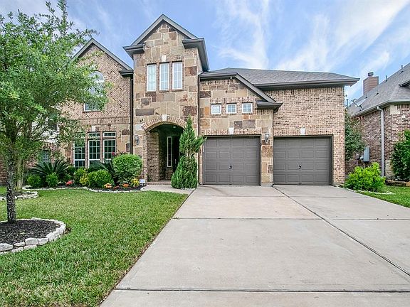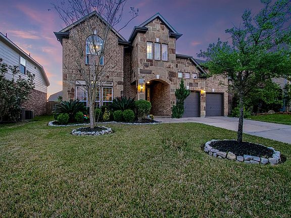 Valencia plan by Westin Homes! Elegant brick/stone elevation with sparkling heated pool/spa and many energy features! Set on a huge lot with offset garage and soaring entrance. Sweeping staircase with wrought iron railing is a stunning focal point in the dramatic two story foyer with diagonally laid tile and curved landing/overlook. The living room is a showstopper with gas log fireplace surrounded by full length windows. Stately Roman columns, arched doorways and crown moulding are just a few of the many upgrades in this fabulous home which includes a private study with French doors and formal dining with chair rail. Gorgeous cooks kitchen with island breakfast bar and sunny dining area, features deep toned cabinetry, tile backsplash and granite counters. The luxurious Owners retreat features a deep corner Whirlpool tub, granite/glass shower and separate vanities. Entertain upstairs in the large gameroom or enjoy warm evenings on the covered patio or cozy gazebo with solar panels.