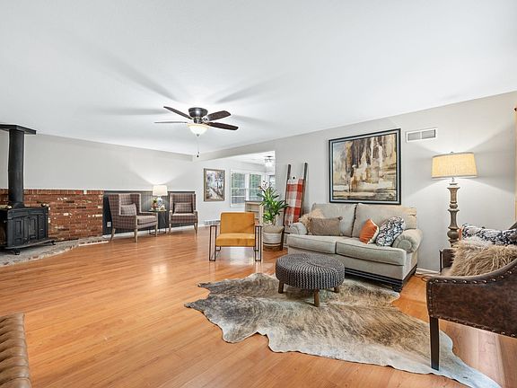 Newly updated and nestled on a large corner lot, this 3-bedroom, 2-bathroom ranch home offers a spacious 1,621 sq ft of chic living space. Step into the expansive living room, featuring a cozy wood-burning fireplace, ideal for gatherings and leisurely evenings. The kitchen shines with a fabulous breakfast bar, perfect for casual dining. The master suite offers a serene escape with dual his and hers closets. Significant upgrades include fresh paint throughout—ceilings, walls, and trim—new bathroom flooring, vanity and a completely renovated second bathroom. The property boasts an expansive concrete patio in the back, half of which is covered, providing an excellent space for entertaining in any weather.