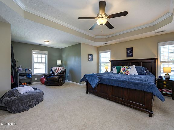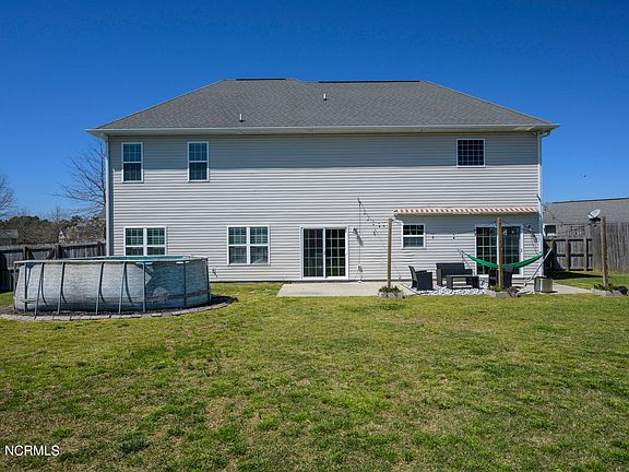 Welcome to your spacious, two-story haven nestled on a charming corner lot. This delightful residence boasts a fenced-in backyard oasis complete with an inviting above-ground pool and a convenient detached building for all your storage needs. Enter through the front door into a grand, two-story foyer, setting the tone for the elegance and comfort found throughout. To the left, a sophisticated formal dining room awaits, perfect for hosting memorable gatherings. On the right, discover a versatile space ideal for a den - offering endless possibilities for relaxation and entertainment. Continue onward to the expansive living room, where a cozy fireplace beckons on chilly evenings, creating the perfect ambiance for cozy nights in. The adjacent kitchen is a chef's dream, featuring a charming breakfast nook, a practical island for meal prep, a spacious pantry, and gleaming granite countertops that exude both style and functionality. A conveniently located office provides the ideal workspace, ensuring productivity without sacrificing comfort. Both the office and breakfast nook offer easy access to the serene back patio through sliding doors, seamlessly blending indoor and outdoor living. Venture upstairs to discover a tranquil retreat comprising four generously sized bedrooms. The luxurious primary suite is a sanctuary unto itself, boasting a serene sitting area, an opulent en suite bathroom, and an expansive walk-in closet - providing ample space for both relaxation and rejuvenation. One of the guest bedrooms features its own walk-in closet and a private bathroom, offering unparalleled comfort and convenience for visitors. With its thoughtful design, abundance of amenities, and prime location, this remarkable home embodies the epitome of modern living in New Bern. Find MCAS Cherry Point in Havelock and North Carolina's Crystal Coast beaches an easy commute away. Don't miss your chance to make this exceptional property your own, contact us today for a private tour!
