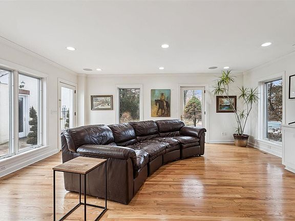 Unique estate setting on 1.5 private acres with circle drive and inground pool in Frontenac.Three bedrooms, two full baths, two half baths, 2,845 sqft and oversized 3-car oversized garage.Courtyard invites guests into living room with floor to ceiling windows, hardwoods floors flowing throughout into updated kitchen w/maple cabinets w/crown, gas range, farmhouse sink, travertine backsplash, quartz counters & butler pantry with wet bar.Dining room opens to office and family room with gas fireplace all overlooking front acreage.Spindled staircase leads to owners suite w/dual closets, updated hall bath, walk-in closet, two additional bedrooms and sunroom.Beautiful landscaping surrounds rectangular swimming pool w/pebble tach along w/side patio & wood burning stone fireplace just off kitchen that is perfect for entertaining.Copper gutters, slate roof, highly rated Ladue School District on 1.5 level acres goes unmatched for this location in Frontenac priced under one million!