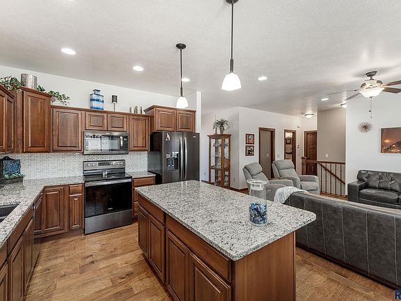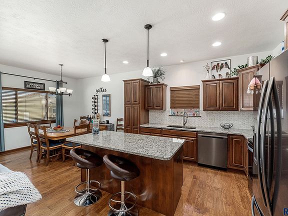 You will Enjoy the sunsets from the covered deck of this Westside home. The Main floor on this ranch home claims 3 bedrooms, 2 baths and a large living room open to the dining and kitchen area. There's Custom cabinets w/crown molding, breakfast bar, granite counters an beautiful solid wood flooring throughout. Whirlpool appliances, solid core doors, poplar wood trim, 9ft ceilings, walk-in tile shower in the primary bath, tile floors in bathrooms & laundry room. Quality features include: Hardie board siding, engineered floor trusses, concrete front stoop, Windsor windows, 92% Hi-efficiency furnace & A/C. This home is equipped with Generac Generator! In the Sioux Falls school district near Schools, shopping & Family Wellness center. The basement has been finished to suit the main level with two bedrooms, full bath, large bar area and fireplace in the family room. This home has an unbelievable amount of storage, oversized 3 stall garage and a fenced yard. Ready for your viewing!