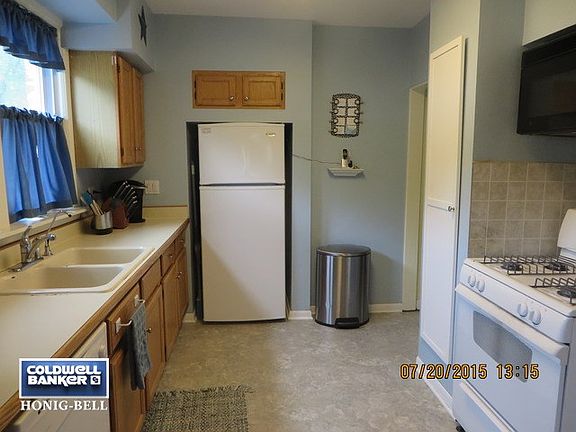 There really is a beach view! Third house from lake and park. Large double lot with 6' cedar fence. Entertainment sized deck with paver patio. Detached 1 car garage is two cars deep. Long driveway for 4 cars to park. Shed. Basement has exterior access. Enclosed front porch. First floor bedroom could be office/craft room or ... Master bedroom has two closets, one is walk in. Bathroom has higher countertop and ceramic tiled shower/tub surround, solar tube. All appliances included. Kitchen floor has hardwood under vinyl. RO water filter system in kitchen. Whole house water filter. Most windows new in last 5 years and are low E. Furnace, water heater, AC, well tank and roof NEW in 2006. Carpet in FR is NEW. Driveway NEW in 2014. Upgraded electric with 200 amp service.