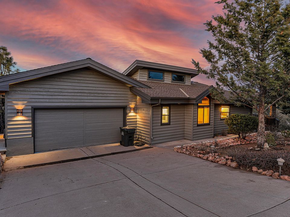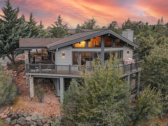 Enjoy the rustic lodge style atmosphere and essence of this mountain retreat that occupies an entire acre and your neighbor is over 2 million acres of the Tonto National Forest with your own gate access. Located at the end of a cul-de-sac, this home is charming, secluded and quiet. Entry offers a welcoming and comfortable great room with vaulted tongue and groove wood ceiling. The primary bedroom suite is also on the main level. Large view windows capture the majestic Mogollon Rim and view the wonderful Granite Dells from the new expansive front deck featuring low maintenance composite material. The lower level offers its own family room and office space, 2 additional bedrooms and fully remodeled bathroom.