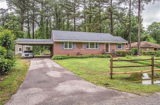 Wall to wall spaciousness is offered in this well cared for, maintenance free home, situated on a generous sized lot. Seeing is believing as this beauty has 1887 sq ft. of easy living space. This home is alive and full of personality and from the moment you enter, you will feel at home in this spacious 3 bedroom, 1.5 bath ranch featuring living room, formal dining room, eat in kitchen, office/den, hobby/entertainment room, mud room, utility room and master bedroom with half bath. And there are also 2 additional bedrooms ! The exterior boasts a 2 space carport, and rear screened porch to complete this picture perfect home! This home is ideally suited for those looking for spacious one level living. Conveniently located to Fort Lee, shopping, grocery stores, and restaurants. See it...you'll want to own it!