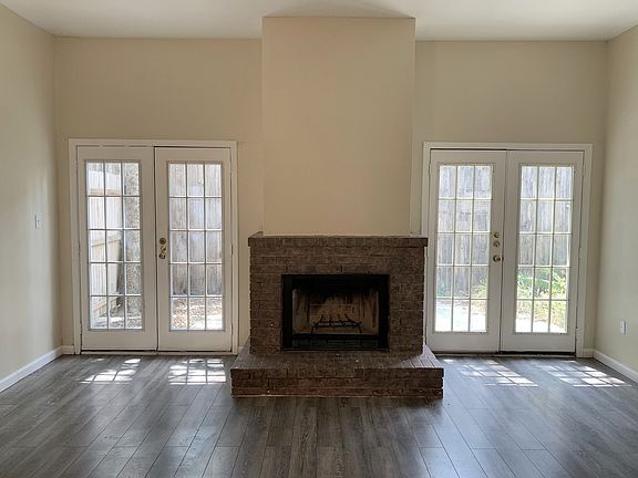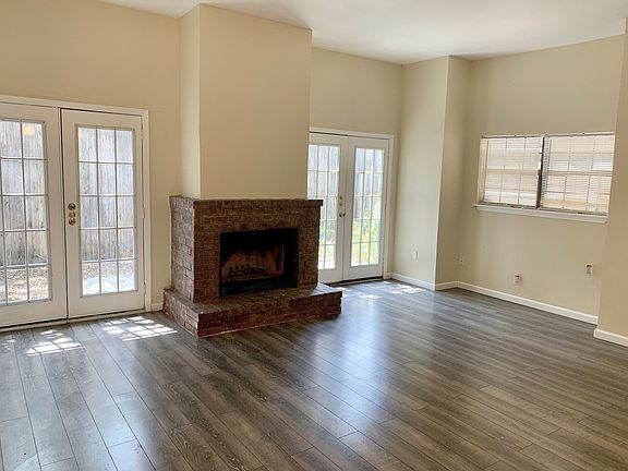 Wood burning fireplaceModern white cabinetsCozy living spaceStainless steel appliancesTwo spacious bedroomsStunning rustic wood floorsInviting patio space